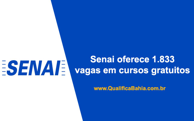 No total, são 1.833 vagas, sendo todos gratuitos. Os interessados devem se inscrever exclusivamente pela internet, em cursosgratuitossenai.fieb.org.br. A lista completa dos cursos está disponível nos editais, bem como a carga-horária, a quantidade de vagas por localidade/curso e o perfil dos candidatos (idade e escolaridade).