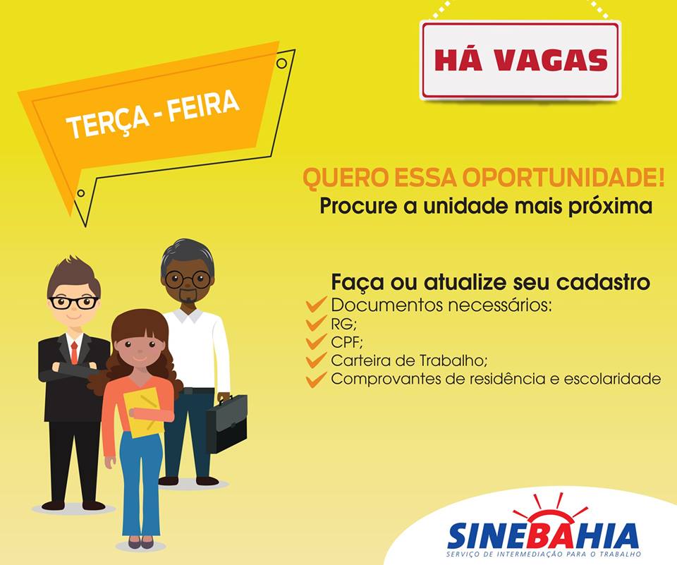 Os interessados devem se dirigir à unidade do SineBahia mais próxima com a documentação necessária em mãos ou faça a busca de vagas através do portal (empregabrasil.mte.gov.br) e do aplicativo SINEFácil.