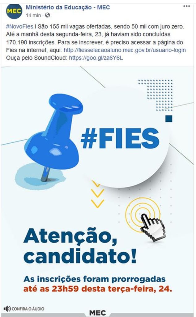 As inscrições para o Financiamento Estudantil (Fies) do segundo semestre de 2018 foram prorrogadas até as 23h59 desta terça-feira (24). Para se inscrever, é preciso acessar a página do Fies na internet.