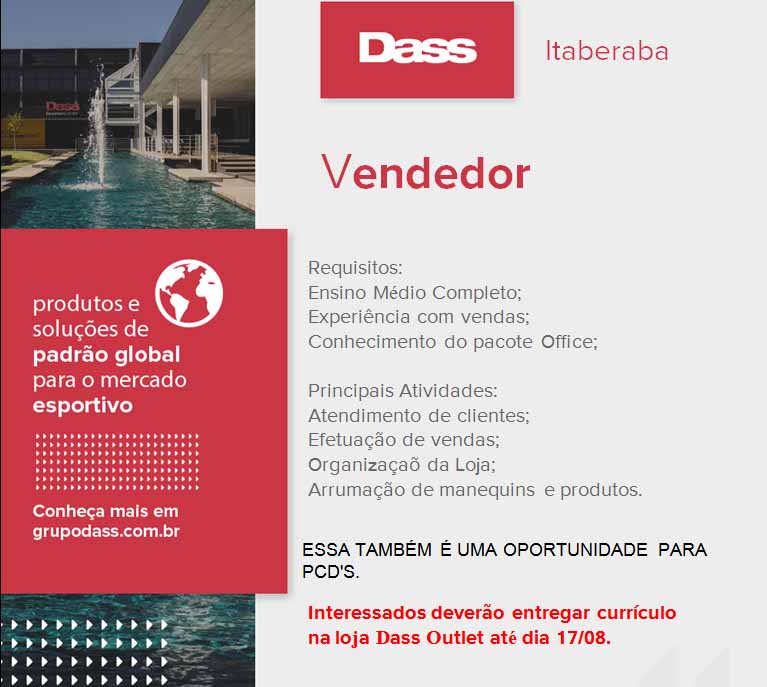 A Loja Dass Outlet está com vaga para vendedor em Itaberaba.