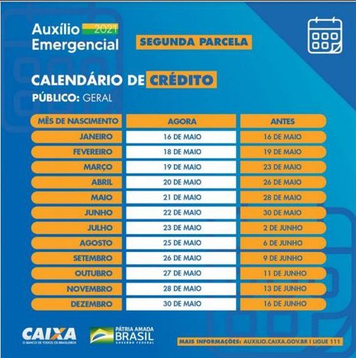 A Caixa Econômica Federal anunciou que vai antecipar os pagamentos da segunda parcela do auxílio emergencial. O novo calendário tem início no dia 16 de maio, com os depósitos para os nascidos em janeiro, e vai até o dia 30 de maio para os nascidos em dezembro. Antes, os pagamentos seriam feitos até 16 de junho.