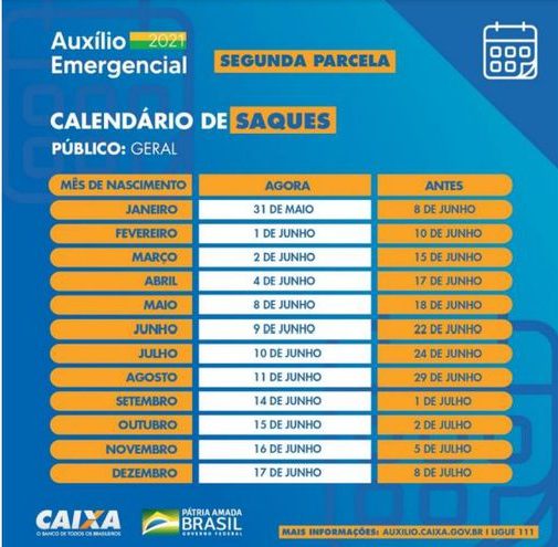 O segundo ciclo de pagamentos, que estava marcado inicialmente para encerrar em 8 de julho, com a possibilidade de saques para os nascidos em dezembro, agora vai ser finalizado no dia 17 de junho.
