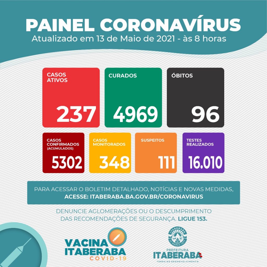 A Prefeitura de Itaberaba, por meio da Secretaria Municipal da Saúde, informa o boletim diário de quinta-feira (13) com dados consolidados até as 17h de quarta-feira (12).