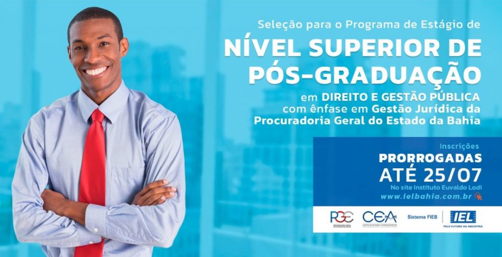 Foi prorrogado até o próximo dia 25, o período de inscrições da seleção para o Programa de Estágio de Nível Superior de Pós-graduação em Direito e Gestão Pública com ênfase em Gestão Jurídica da Procuradoria Geral do Estado da Bahia. As inscrições são gratuitas e estão sendo realizadas através do site do Instituto Euvaldo Lodi – www.ielbahia.com.br.