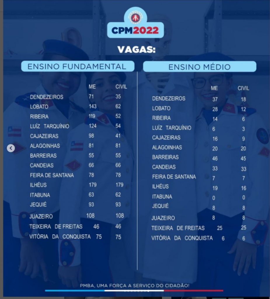 Já para os CPMs de Alagoinhas, Barreiras, Candeias, Feira de Santana, Ilhéus, Itabuna, Jequié, Juazeiro, Teixeira de Freitas e Vitória da Conquista, a distribuição de vagas será de 50% para o grupo de militares ou servidos públicos da PM e CBMBA e 50% para o público em geral.